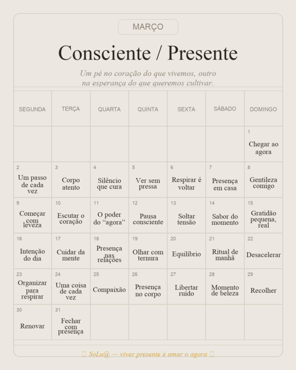 Há meses que começam devagar. E há meses que pedem silêncio. Março, para mim, não é sobre fazer mais. É sobre estar mais. Estar no agora. Estar nas pequenas escolhas. Estar nas conversas sem telemóvel na mão. Estar na respiração antes da resposta. Este mês não quero correr atrás do tempo. Quero caminhar com ele. O calendário que partilho hoje não é uma lista de tarefas. É um convite. Um gesto por dia. Uma presença pequena, mas intencional. Porque viver presente é um (...)